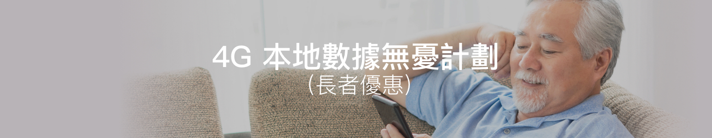 - 4G本地數據無憂計劃(長者優惠)只適用於選用4G本地數據無憂計劃(長者優惠)5GB月費計劃並簽訂固定合約期24個月之指定客戶,客戶須於登記服務時已年滿60歲,並須出示身份證明文件以作證明,每個香港身份證號碼或護照只可享長者月費優惠一次。