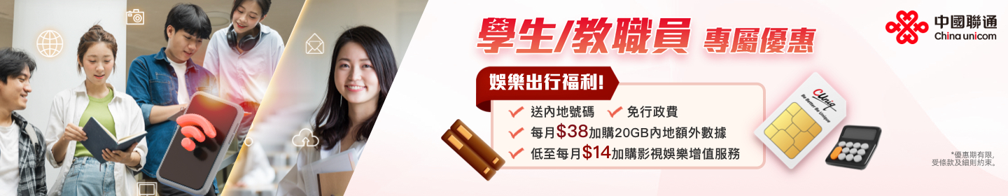 - 由即日起至2026年6月30日,新客戶於網上成功申請上台簽約「5G校園本地數據無憂計劃(30GB、50GB、100GB)」並同時加購指定增值服務, 可享增值服務半價月費優惠. 固定合約期後增值服務將回復正價收費。
